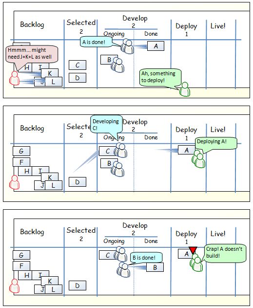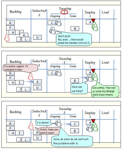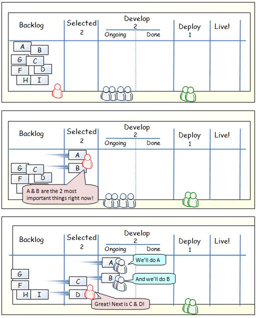For a given project, a number of states are decided on, for instance backlog, develop, test and deploy. Each of these states can have a limit to the number of items that can be in that state at any given time. In this example, the develop state may have a limit of three while the test state may have a limit of two. Nothing can be moved from one state to the next if that limit has been reached. Some states may not have a limit – the backlog, for instance.